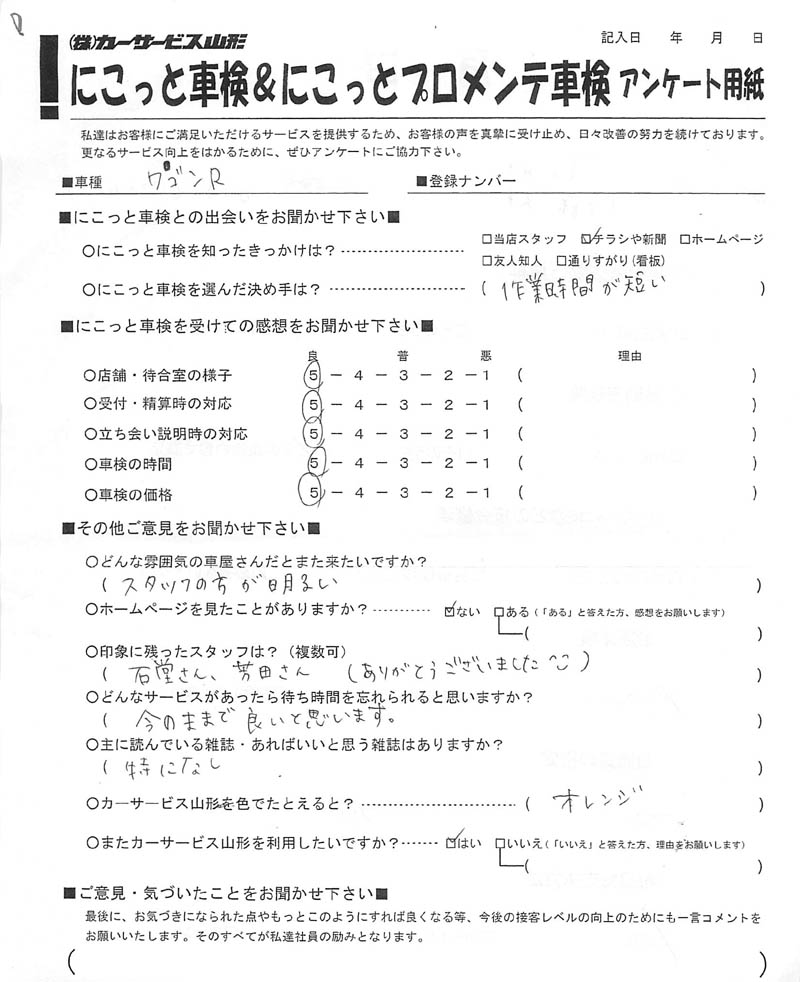 カテゴリー:お客様の声, スズキ車検, にこっとプロメンテのお客様の声, にこっと車検のお客様の声, メーカー・車種から選ぶ, ワゴンR車検 Tags: アンケート, ワゴンR, 山形, 車検