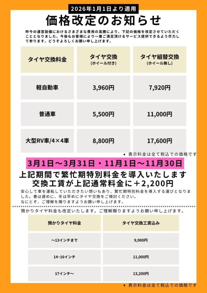 また、繁忙期特別料金を導入させていただく事となりました。